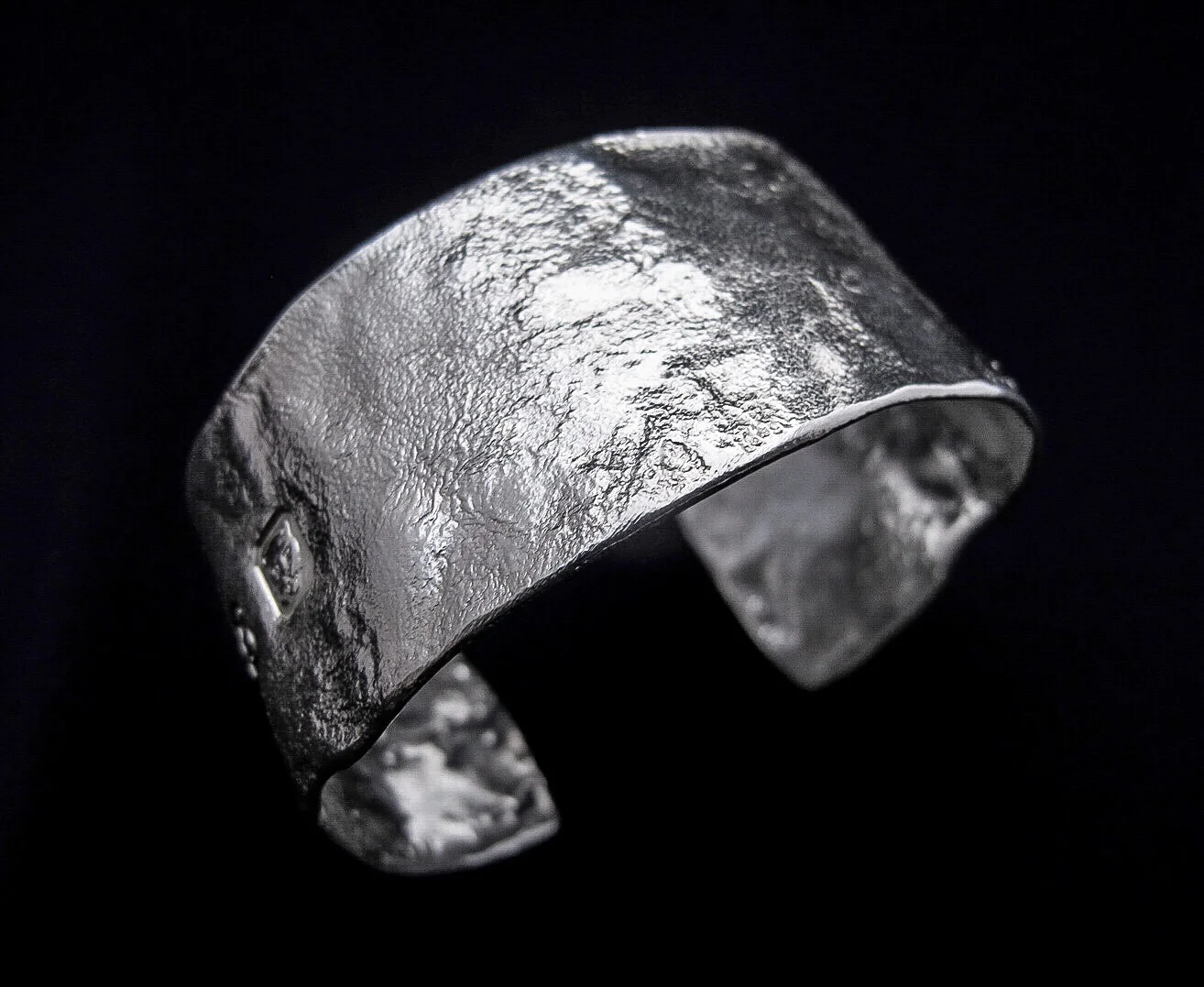 This organically textured sterling silver cuff is out to make a statement. It has been finished with 9ct gold decoration and has a feature hallmark to one side. Each one of these cuffs is unique and timeless so would make for a fantastic gift.